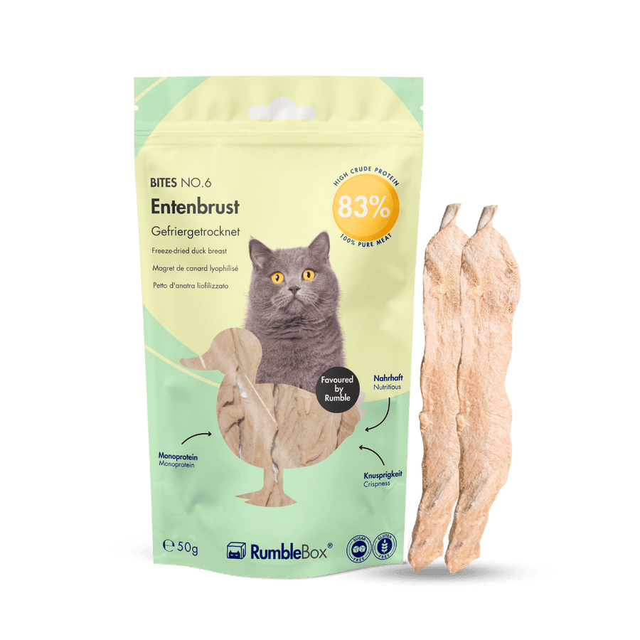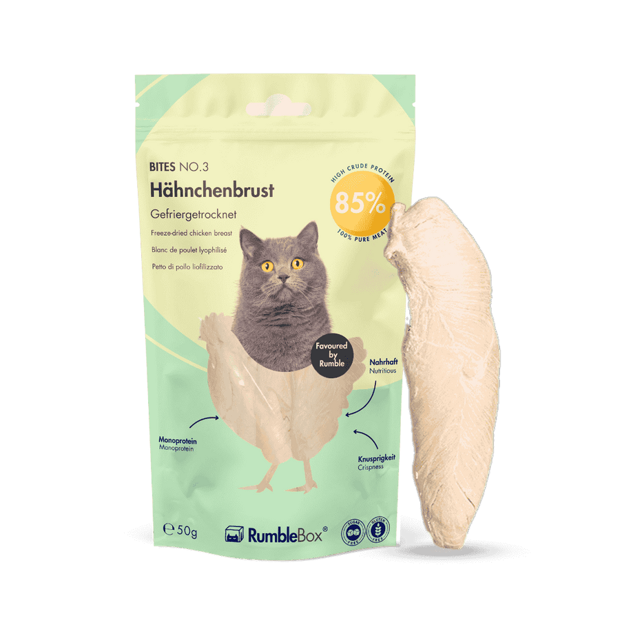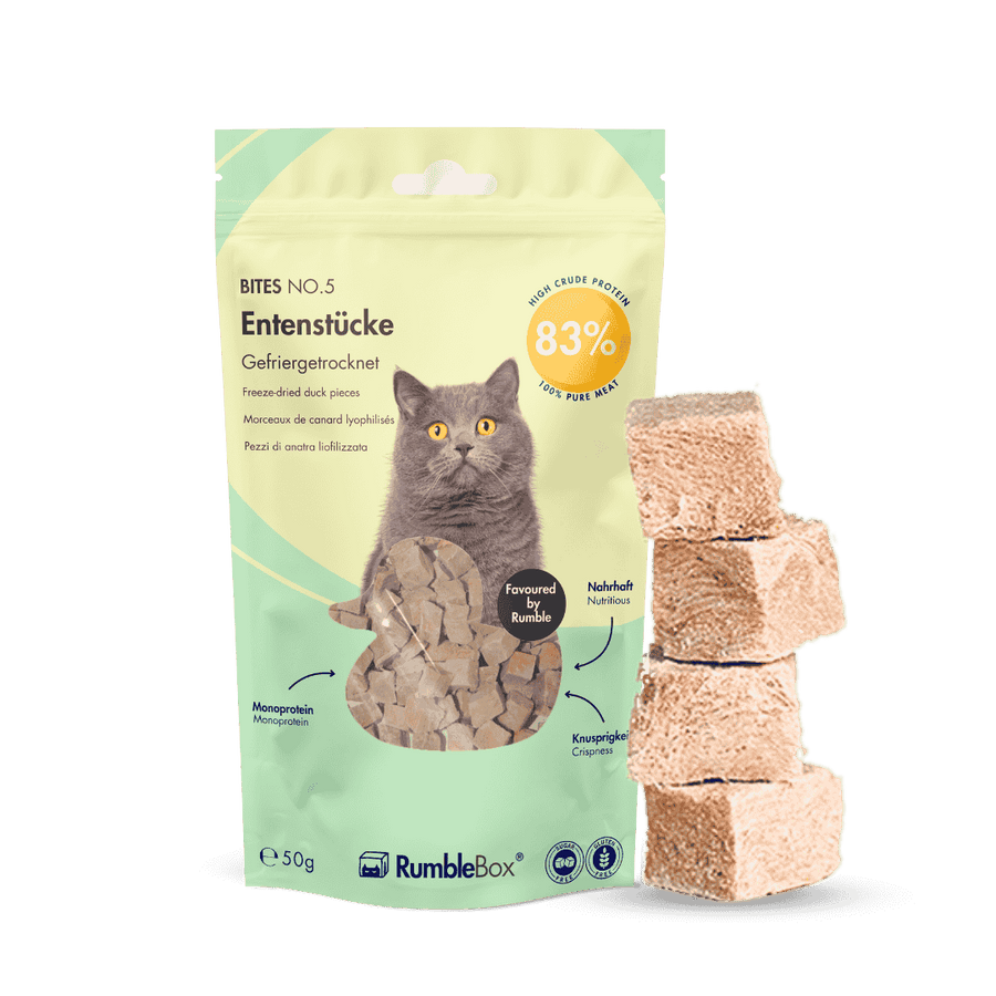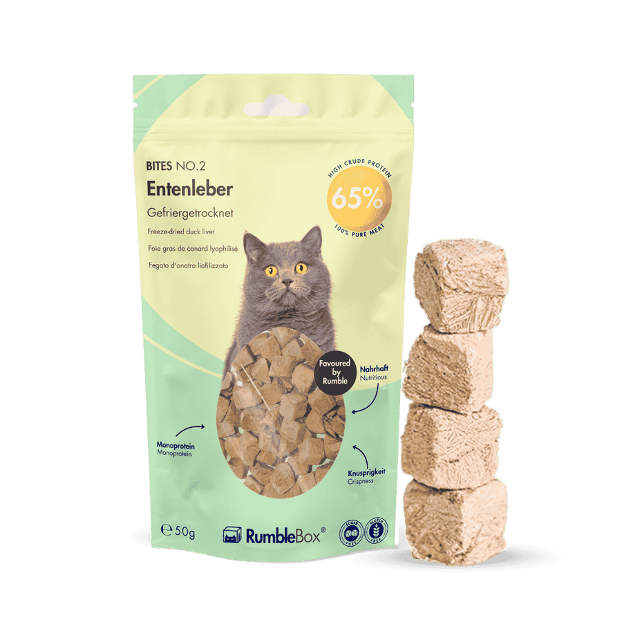Entdecken Sie die gefriergetrockneten Katzensnacks von RumbleBox – 100 % natürlich, 100 % lecker und perfekt für jede Lebensphase Ihrer geliebten Samtpfote! Unsere gesunden Leckerlis für Katzen bestehen aus reinem Fleisch, denn Katzen sind von Natur aus Fleischfresser. Dank der schonenden Gefriertrocknung bleiben alle wertvollen Nährstoffe erhalten, und die Snacks passen optimal zu den natürlichen Ernährungsgewohnheiten Ihrer Katze.